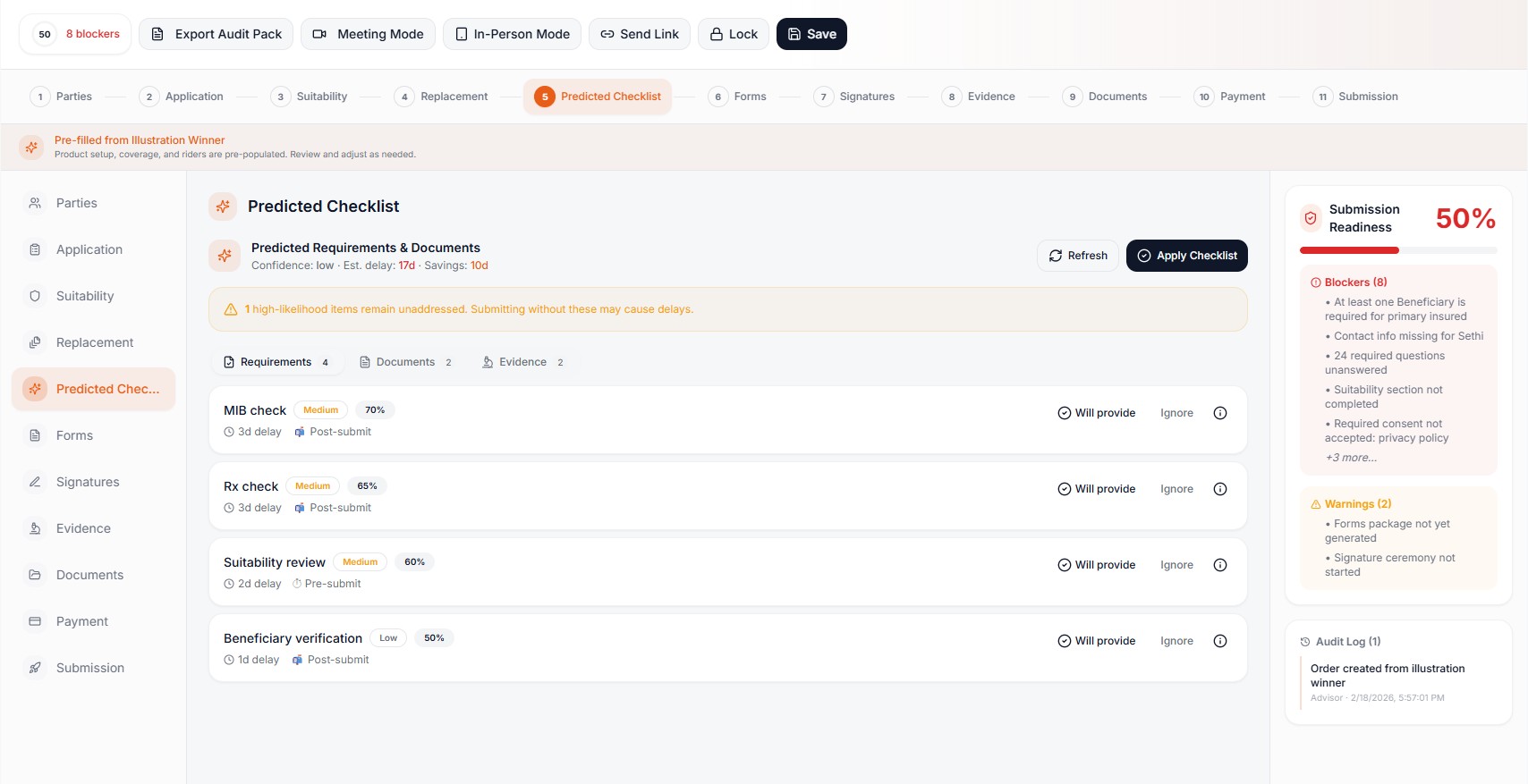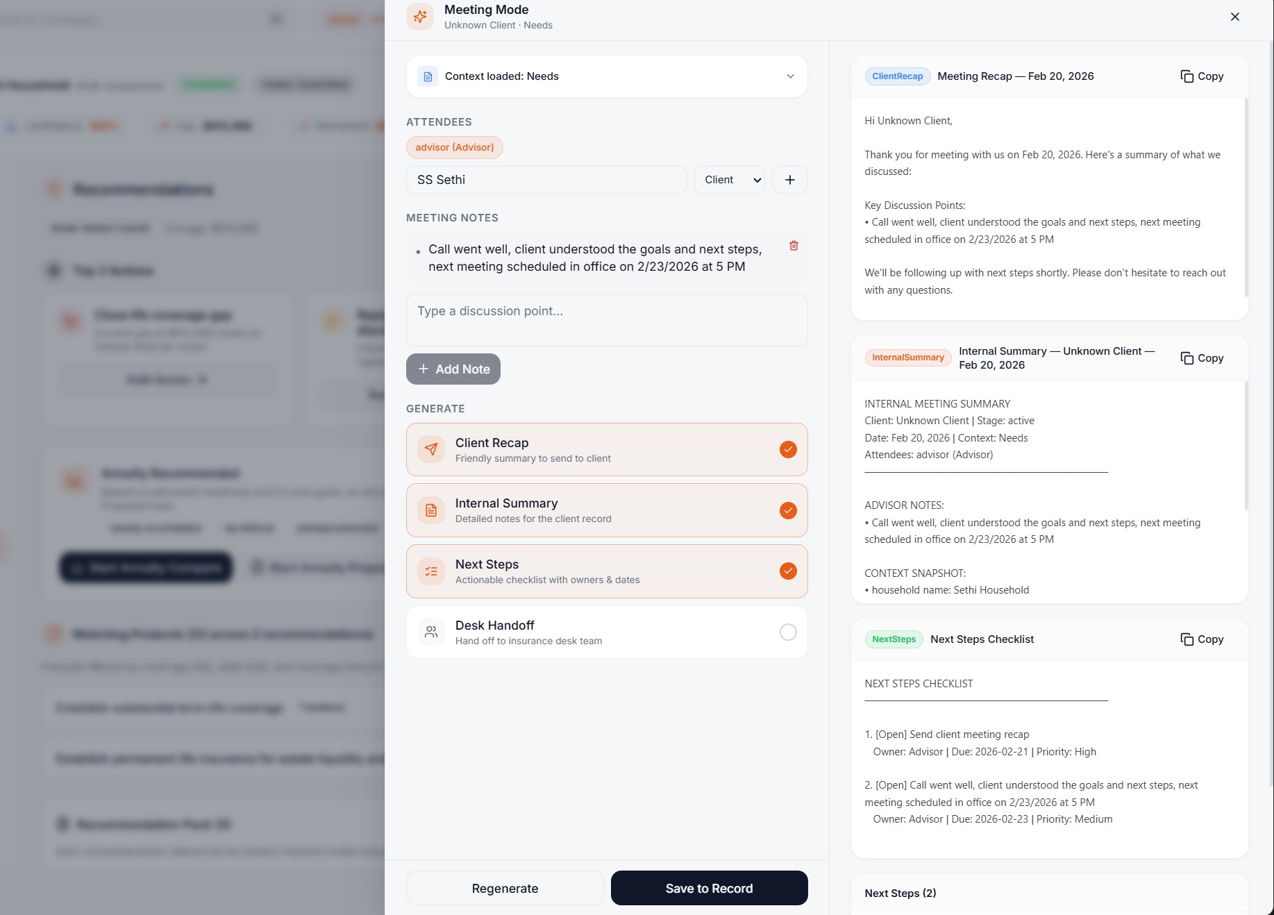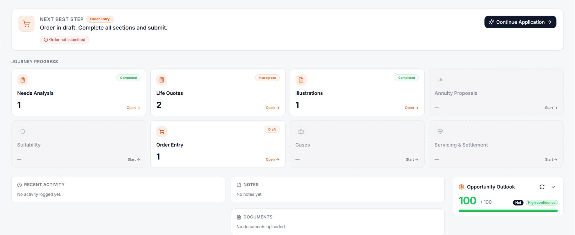 Create a quote case, open a client, generate an illustration PDF, send a client link, or push a case to the desk without hunting through menus. Always confirms before high-impact steps and logs what happened.