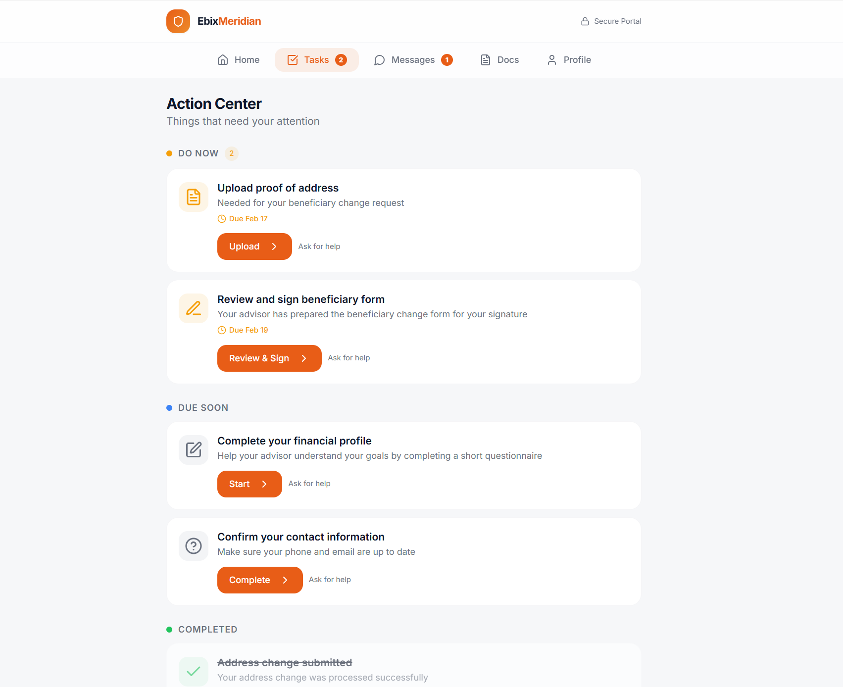 A mobile-first portal with tasks, documents, messaging, and proposal review — all secured and branded for your firm.